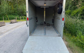 Our 7by14 enclosed trailer is set up to haul two large motorbike. The motorcycle wheel chocks can easily be removed so the trailers can be used to haul household items! The back door doubles as a full width rear ramp for an easy loading experience. This trailer is capable of hauling 4000lbs.
