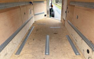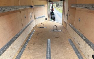 Trailer hitch and ball, 8 tethered e-track anchors, 8 ratchet straps, 2 e-track motorcycle chocks, trailer locking devices.