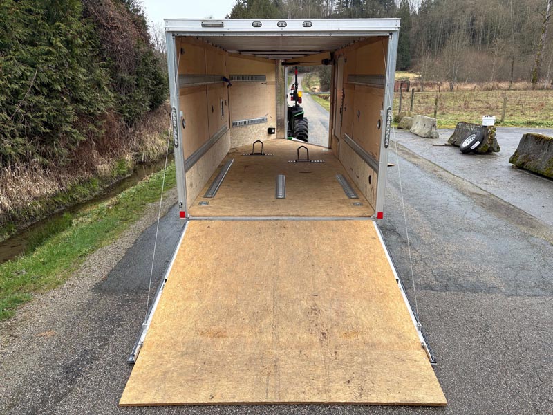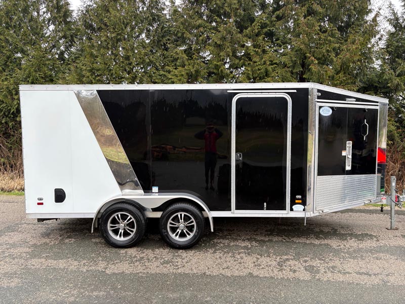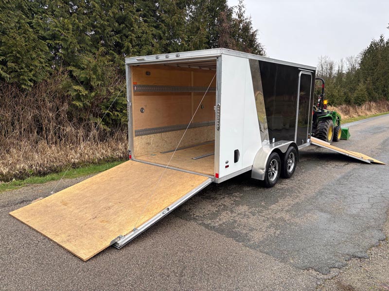 Our 7by14 enclosed trailer is set up to haul two large motorbike. The motorcycle wheel chocks can easily be removed so the trailers can be used to haul household items! This trailer is equipped with a drop down front ramp as well, no need to back out your bikes or machines! Added bonus of a small fuel door to make refuelling machines that much easier! This trailer is capable of hauling 4000lbs.