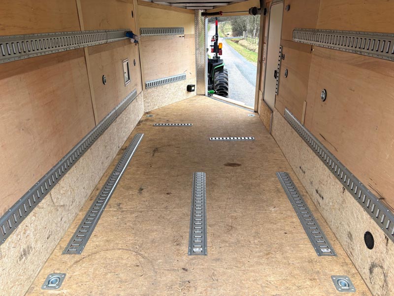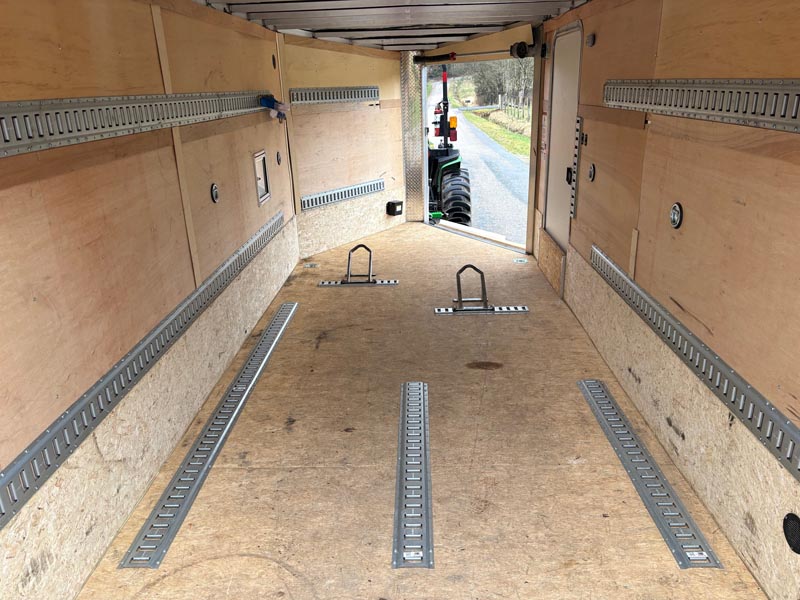 Trailer hitch and ball, 8 tethered e-track anchors, 8 ratchet straps, 2 e-track motorcycle chocks, trailer locking devices.